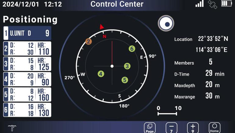 The system continuously monitors and transmits divers’ blood oxygen saturation (SpO₂) levels in real time, a key parameter for assessing physical condition and respiratory function. Divers can clearly view their own blood oxygen readings on the dive navigation computer, while surface command personnel can monitor the entire team’s SpO₂ status, achieving full situational awareness.